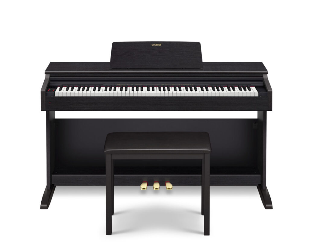 Casio Celviano AP-270 | This AP-270 is a black elegant piano to fit any space with 88 Full size weighted-scaled hammer action ebony & ivory touch keys, 3 pedals, sliding key cover and deluxe matching bench. Features also include Casio’s state-of-the-art AiR Sound Source, 4-Layered stereo grand piano sound, touch response, hammer response & damper resonance simulation, two grand piano sounds, 22 enhanced tones, 2 Track / 1 Song Recorder and more!
